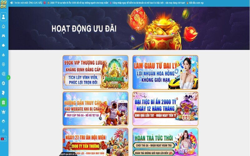 Nếu bạn là người chơi đang tìm kiếm một sân chơi không chỉ uy tín, game đa dạng mà còn có khuyến mãi hấp dẫn thật sự, thì 99ok chính là lựa chọn lý tưởng. Với chính sách ưu đãi “mạnh tay”, liên tục tung ra chương trình thưởng cho người mới, người chơi lâu năm, thành viên VIP hay thậm chí cả người thua lỗ, nhà cái này đang thu hút đông đảo game thủ Việt Nam. Vậy chương trình khuyến mãi 99ok có gì hấp dẫn? Có dễ nhận không? Dưới đây là bài review chi tiết giúp bạn hiểu rõ từng loại khuyến mãi của nhà cái.