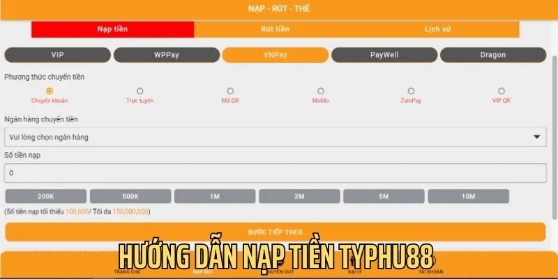 - Bước 3: Typhu88 cung cấp nhiều hình thức nạp tiền. Hãy chọn phương thức tiện lợi nhất với bạn.